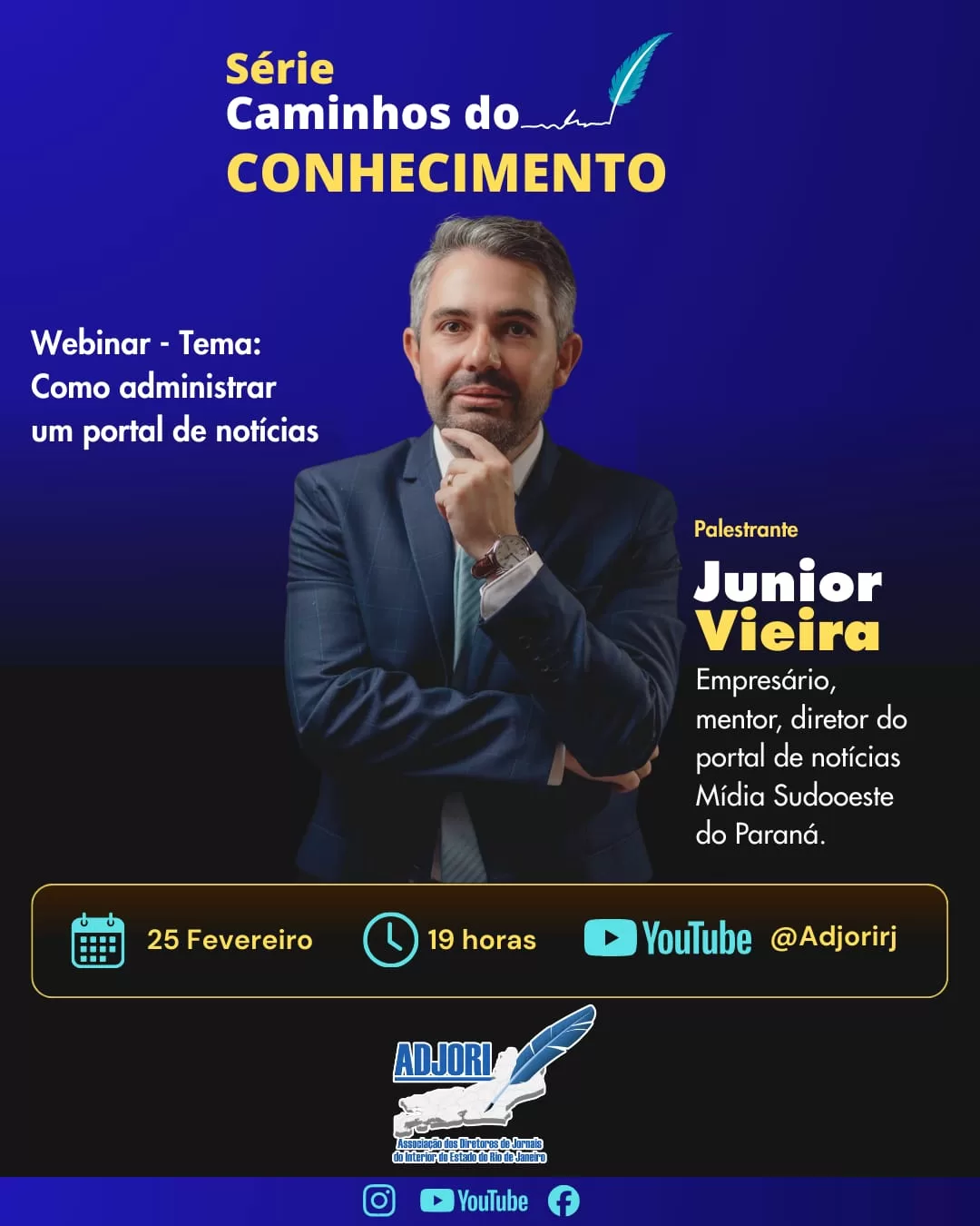 A Adjori RJ – Associação dos Diretores de Jornais do Interior do Estado do Rio de Janeiro – lança, a partir do dia 25 de fevereiro de 2026, a série de webinars intitulada “Caminhos do Conhecimento”. A iniciativa tem como objetivo promover a troca de experiências, a capacitação e o debate sobre comunicação, empreendedorismo e inovação no jornalismo do interior.