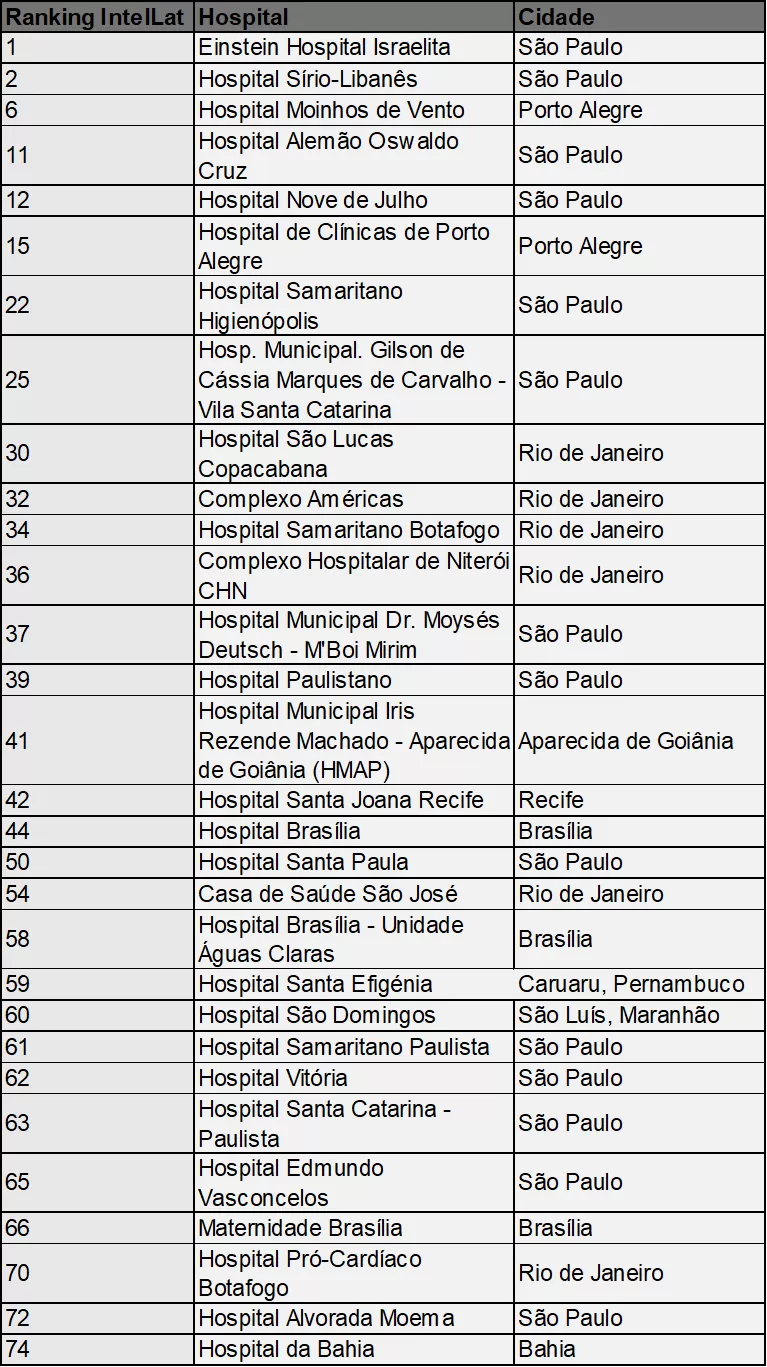 Participaram do estudo da IntelLat, realizado anualmente desde 2009, 80 hospitais latino-americanos. Entre os seis melhores brasileiros estão: Einstein Hospital Israelita, Hospital Sírio- Libanês, Hospital Moinhos de Vento, Hospital Nove de Julho, Hospital de Clínicas de Porto Alegre e Complexo Hospitalar de Niterói (CHN).