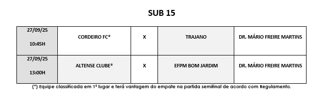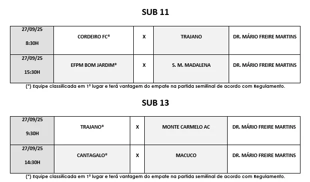 Com o término dos jogos da fase classificatória, após a realização de 72 jogos entre as categorias Sub 11, Sub 13 e Sub 15 ficaram definidos os semifinalistas de cada categoria. Os jogos da semifinal acontecem neste sábado (27-09), no Estádio Dr. Mário Freire Martins, em Macuco, com a seguinte programação.