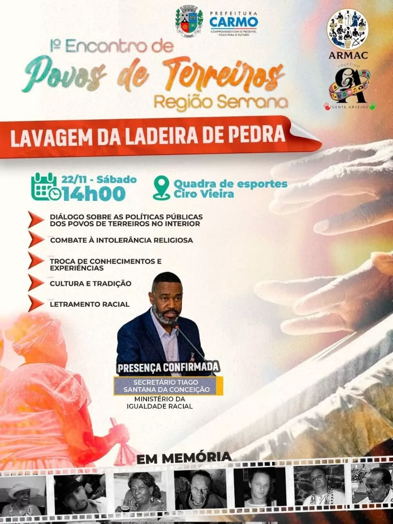 A Associação de Religiões de Matrizes Africanas de Carmo, o Coletivo Gente Arteira e a Prefeitura Municipal de Carmo convidam para o primeiro Encontro de Povos de Terreiros da Região Serrana, um dia dedicado ao diálogo, à memória e ao fortalecimento das tradições que fazem parte da identidade do nosso povo.