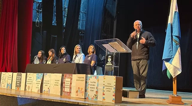 A distribuição ocorreu no Teatro Municipal Laercio Rangel Ventura, na Praça do Suspiro, durante a abertura na cidade, pela Secretaria Municipal de Educação, do programa do governo federal Compromisso Nacional Criança Alfabetizada.