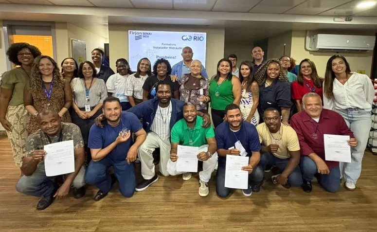 Aos 30 anos, Gabriel Agostinho exibe com orgulho o novo certificado de capacitação profissional. Morador do Morro do Urubu, em Pilares, na Zona Norte carioca, o líder comercial da Águas do Rio integrou a primeira turma do curso gratuito de bombeiro hidráulico promovido pela concessionária em parceria com o Sesi/Firjan.