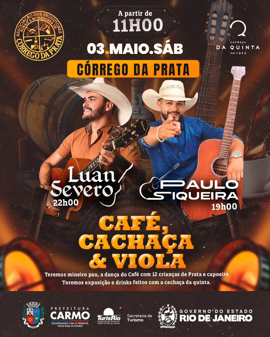 O evento ‘Café, Cachaça e Viola’ nesta edição é realizado pela Prefeitura de Carmo, por meio da Secretaria de Cultura e Turismo, em parceria com o TurisRio e o Governo do Estado do Rio de Janeiro. O projeto ainda possui o apoio da Associação de Produtores Rurais e Moradores de Córrego da Prata, a Aprumcop.