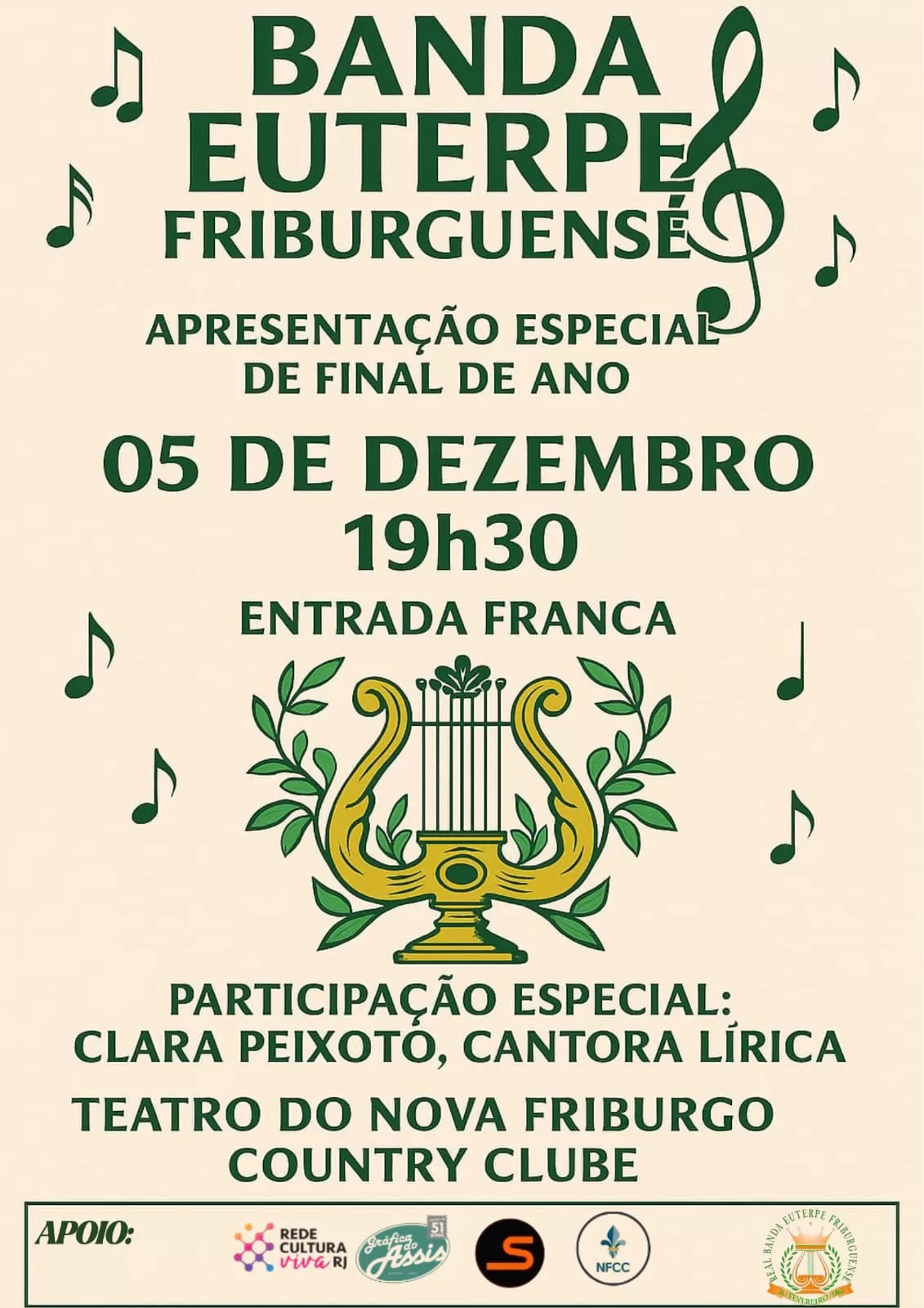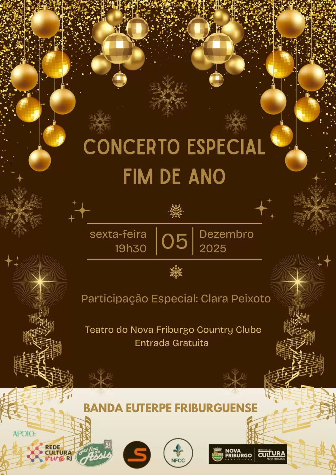 Um Concerto Especial de Natal, com repertório tradicional de canções natalinas, que prometem emocionar o público, incluindo ‘Noite Feliz’, ‘Adeste Fidélis’, ‘White Christmas’, ‘Jingle Bell’, entre outros clássicos. Na noite desta sexta-feira, 5 de dezembro, quem for ao Teatro Barão de Nova Friburgo, do Country Clube, assistirá a mais um espetáculo, com o qual a Real Banda Euterpe Friburguense marca o encerramento de suas atividades neste ano de 2025, sob a regência de seu maestro-titular Nelson José da Silva Neto.
