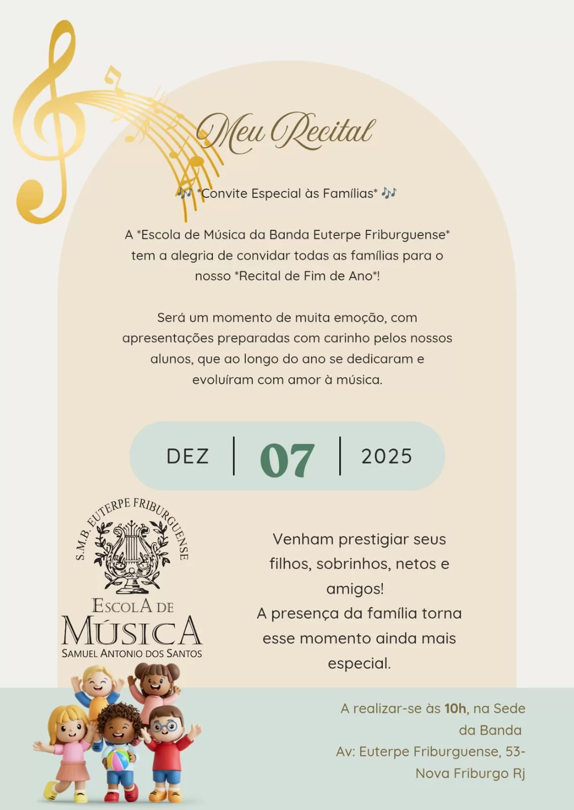 Ainda neste próximo fim-de-semana, o domingo, 07, marca um dos momentos mais aguardados e emocionantes da agremiação musical. Em sua sede nobre, na Avenida Euterpe Friburguense, 53, a partir das 10 h, o recital de conclusão do semestre letivo da Escola de Música Maestro Samuel Antônio dos Santos – fundador da Euterpe, em 1863 – contará com as participações de mais de 30 alunos, em diversos instrumentos: de sopro (metais e palhetas) e percussão. Um dos destaques será a apresentação do grupo de flautas doces, coordenado pelo professor Pedro Gorni, novidade aguardada com grande expectativa, tanto pela Diretoria, quanto pelos pais e familiares dos estudantes.