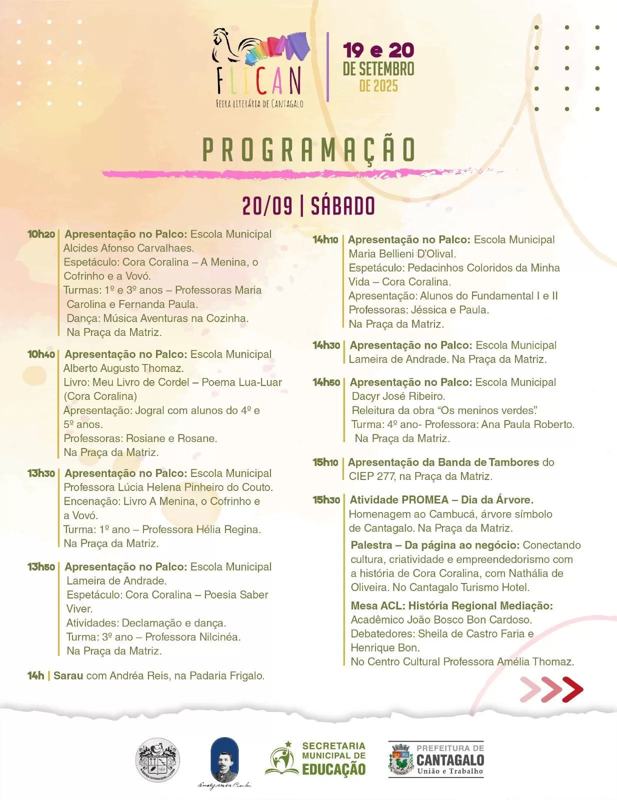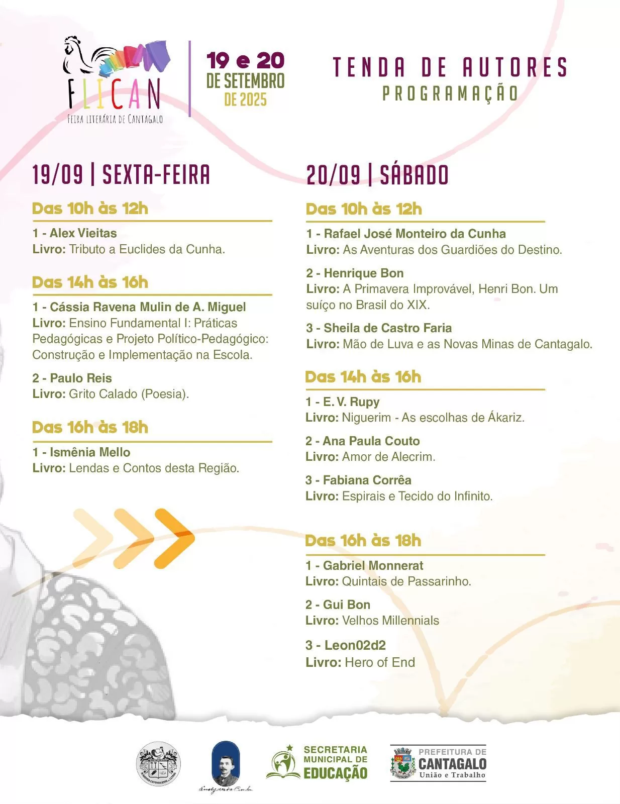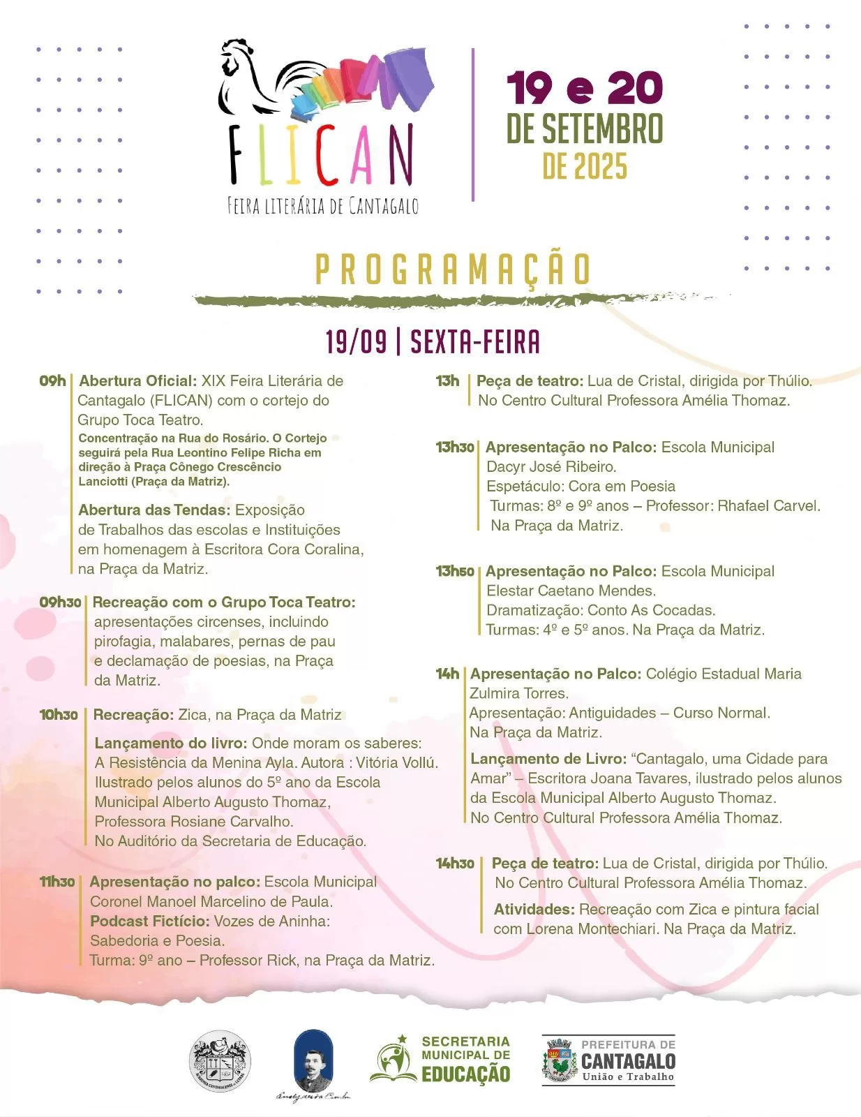 A XIX Feira Literária de Cantagalo – FLICAN, será realizada neste fim de semana, nos dias 19 e 20 de setembro. Durante o evento, os moradores cantagalenses e também visitantes poderão desfrutar de muita cultura, literatura, música, teatro e lançamentos de livros. A iniciativa ainda contará com apresentações das escolas e instituições locais.