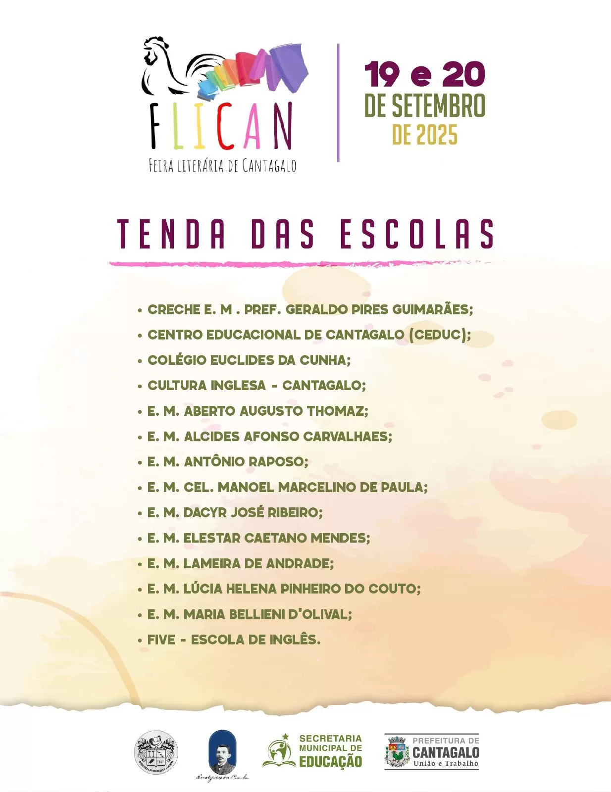 A Feira Literária de Cantagalo possui o apoio da Prefeitura de Cantagalo e da Secretaria Municipal de Educação. O projeto pretende valorizar a cultura local e diferentes talentos da literatura.