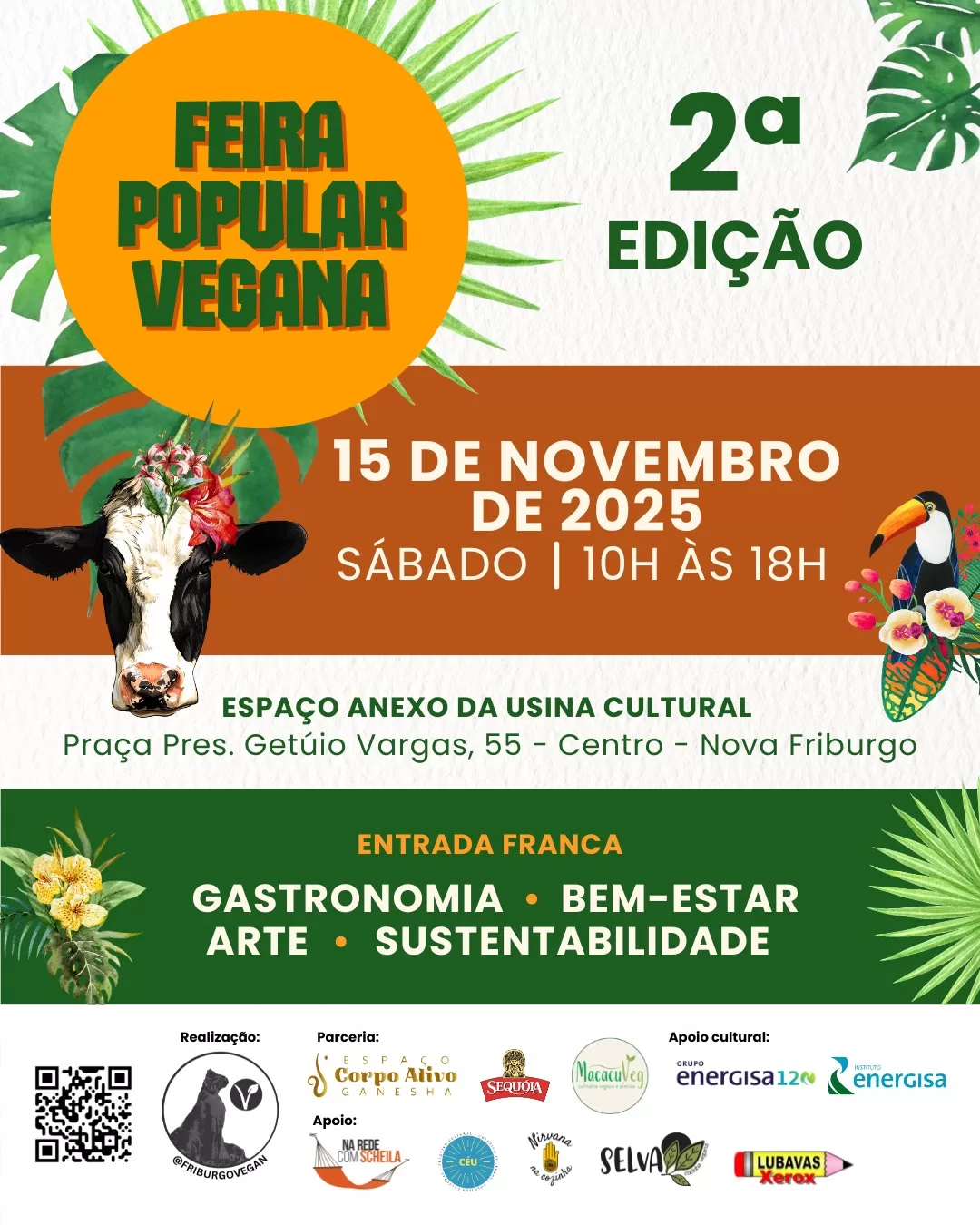 Vegana de Nova Friburgo (Friburgo Vegan) resolveu realizar a segunda edição no dia 15 de novembro (sábado), das 10h às 18h, no espaço anexo (loja) da Usina Cultural Energisa (Praça Pres. Getúlio Vargas, 55 – Centro), com entrada franca. O objetivo dos organizadores é dialogar e apresentar o Veganismo como uma filosofia e estilo de vida, de forma que simpatizantes também possam buscar meios de excluir do seu dia a dia a exploração e a crueldade contra animais, inclusive no que diz respeito a processo de produção e comercialização.
