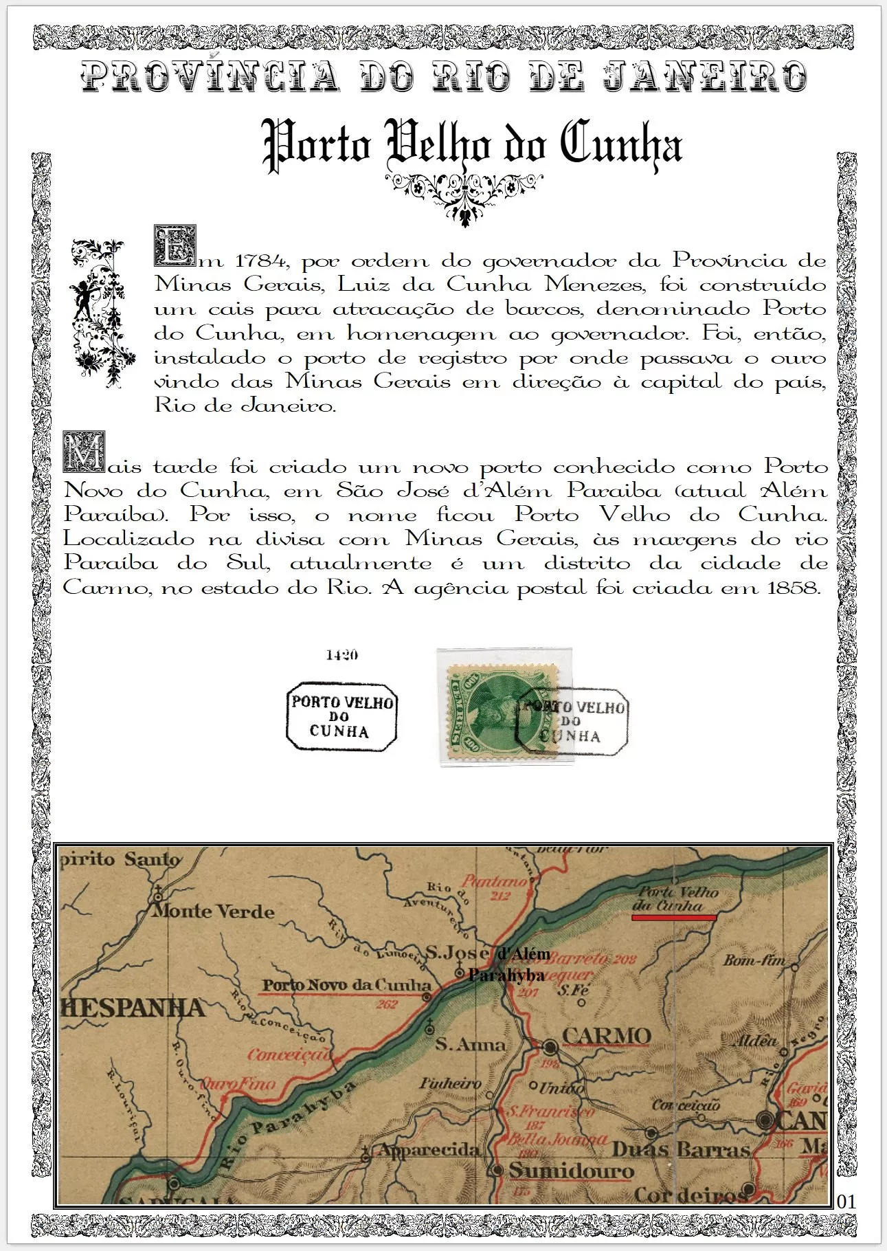 Mais tarde, foi criado um novo porto conhecido como Porto Novo do Cunha, em São José d’Além Paraiba (atual Além Paraíba). Por isso, o nome ficou Porto Velho do Cunha. Localizado na divisa com Minas Gerais, às margens do rio Paraíba do Sul, atualmente é um distrito da cidade de Carmo, no estado do Rio. A agência postal foi criada em 1858.