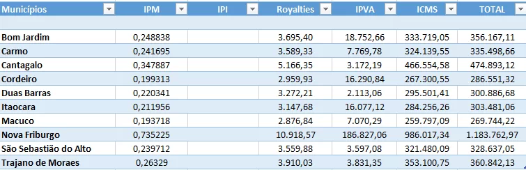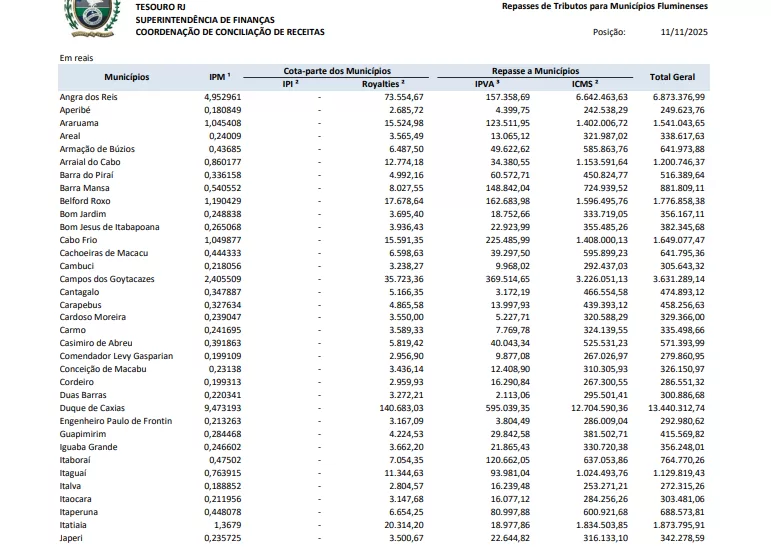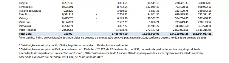 Os repasses aos municípios da arrecadação de Royalties do petróleo e dos tributos IPI e ICMS são liberados de acordo com os respectivos Índices de Participação dos Municípios (IPM), apurados anualmente para aplicação no exercício seguinte, conforme determina a Constituição Federal e observado o disposto na Lei Complementar Federal nº 63, de 11 de janeiro de 1990, nas Leis Estaduais nº 2.664, de 27 de dezembro de 1996, e nº 5.100, de 04 de outubro de 2007, e no Decreto Estadual nº 47.664, de 29 de junho de 2021.