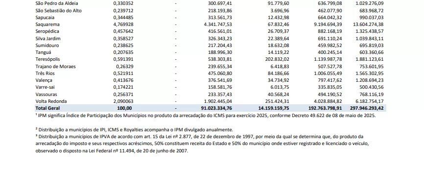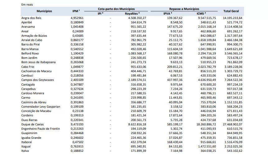 Os repasses aos municípios da arrecadação de Royalties do petróleo e dos tributos IPI e ICMS são liberados de acordo com os respectivos Índices de Participação dos Municípios (IPM), apurados anualmente para aplicação no exercício seguinte, conforme determina a Constituição Federal e observado o disposto na Lei Complementar Federal nº 63, de 11 de janeiro de 1990, nas Leis Estaduais nº 2.664, de 27 de dezembro de 1996, e nº 5.100, de 04 de outubro de 2007, e no Decreto Estadual nº 47.664, de 29 de junho de 2021.