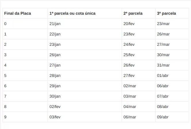 Confira abaixo as datas de vencimento da cota única ou das parcelas do imposto no estado fluminense: