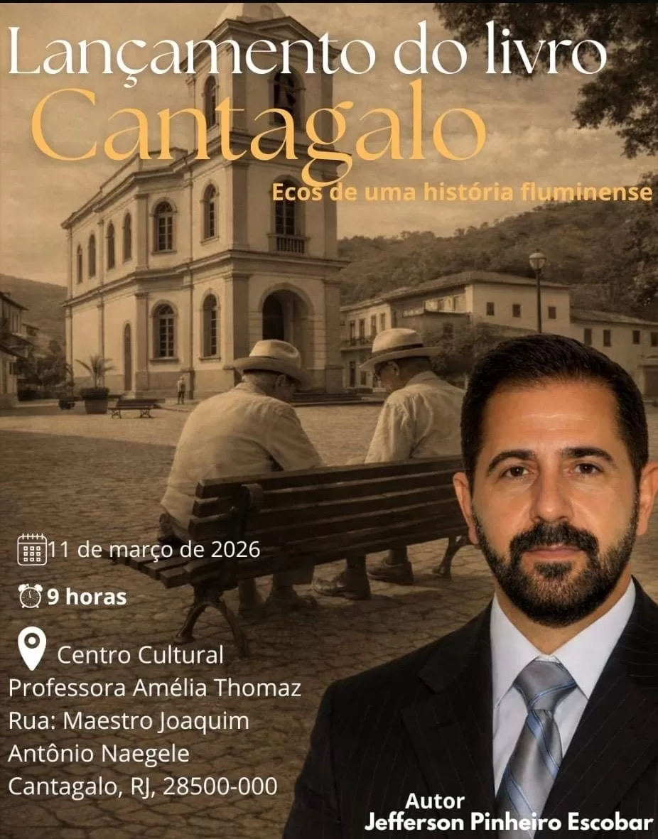 No dia 11 de março, às 9h, acontece o lançamento do livro “Cantagalo – Ecos de uma história fluminense”, de Jefferson Pinheiro Escobar. O lançamento promoverá um encontro especial para valorizar as raízes, preservar memórias e reconhecer a importância da trajetória para o Estado do Rio de Janeiro.