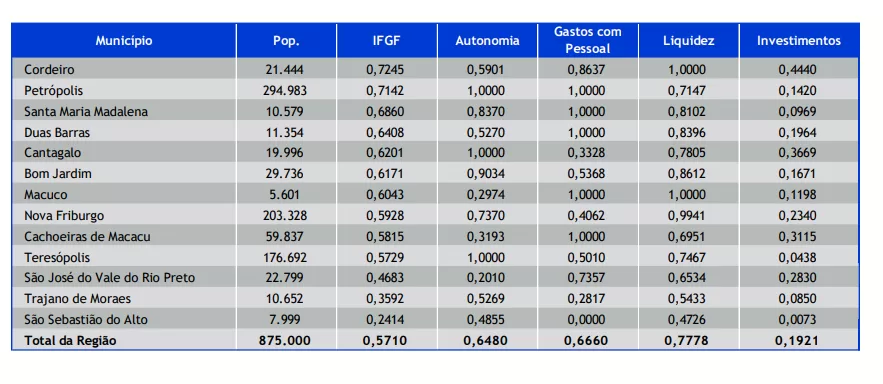 Já Petrópolis, Teresópolis e Cantagalo se destacam pela nota máxima no IFGF Autonomia. Nesses municípios, há alta capacidade de gerar receita local para suprir as despesas essenciais ao funcionamento de seus respectivos municípios.