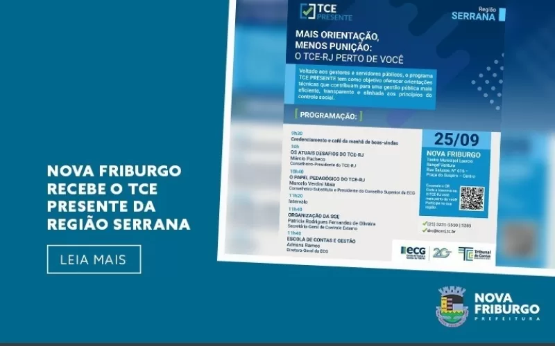 Nova Friburgo será palco da edição regional do “TCE Presente – Mais orientação, menos punição”, no dia 25 de setembro, das 9h30 às 13h, no Teatro Municipal Laercio Rangel Ventura. Promovido pelo Tribunal de Contas do Estado do Rio de Janeiro (TCE-RJ), o evento vai reunir gestores e servidores públicos de toda a Região Serrana Fluminense em um grande encontro de conhecimento, troca de experiências e fortalecimento da gestão pública.
