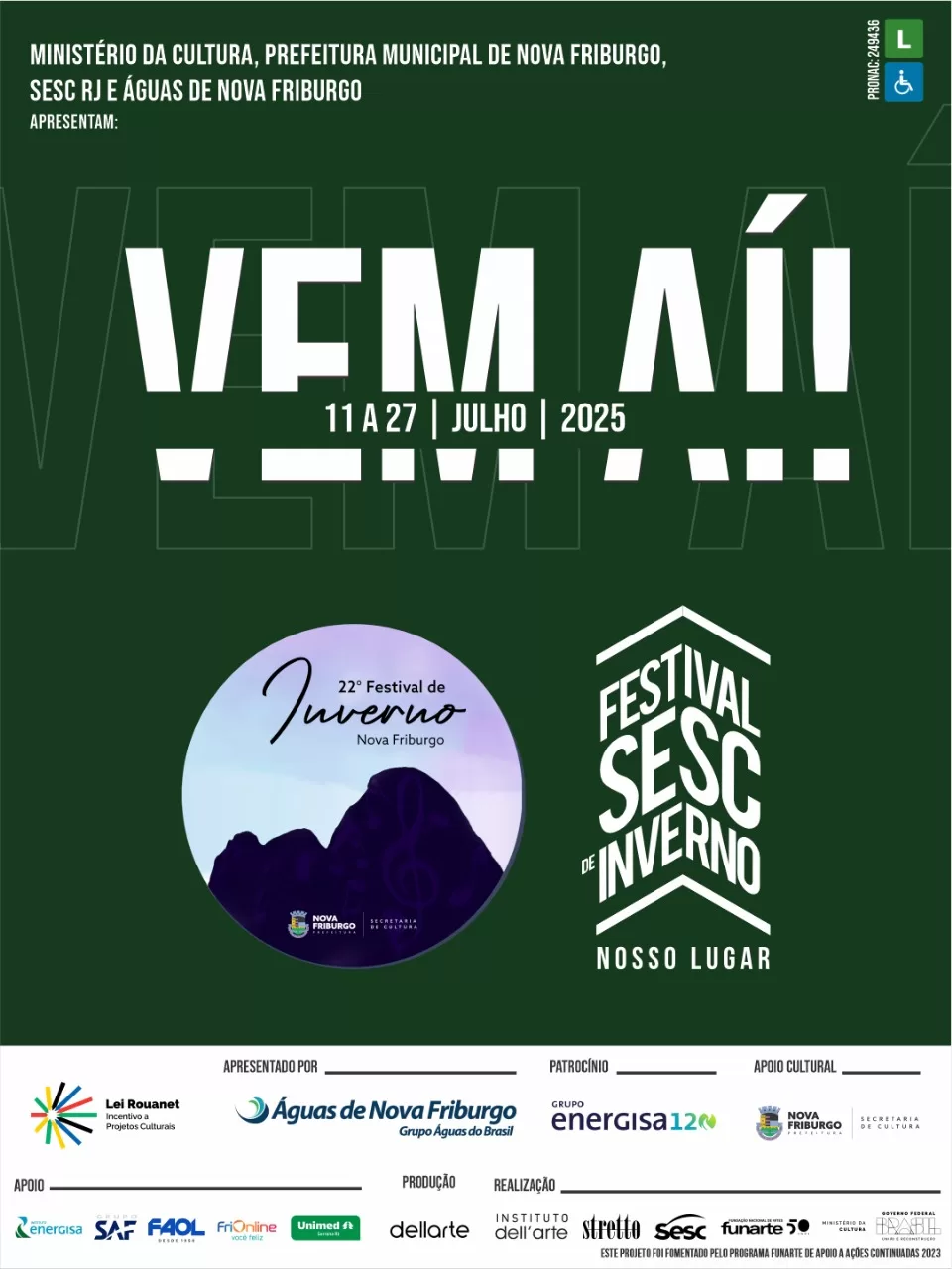 Fruto da união entre a Prefeitura de Nova Friburgo e o Sesc RJ, nasce o maior Festival de Inverno dos últimos tempos, com uma programação vibrante, democrática e totalmente gratuita. Serão mais de duas semanas de música, teatro, dança, cinema, exposições, oficinas, literatura e muito mais, aquecendo o coração da serra fluminense com o melhor da cena cultural brasileira.