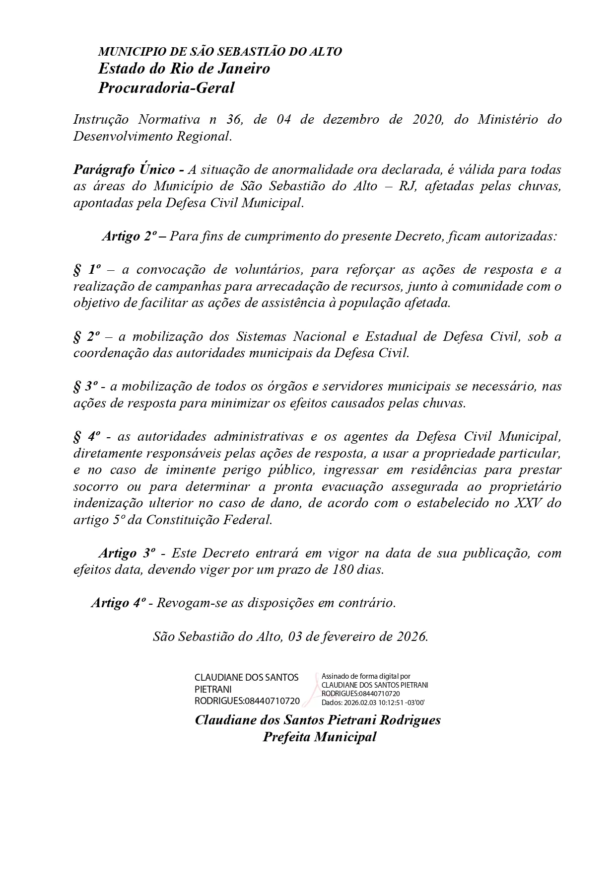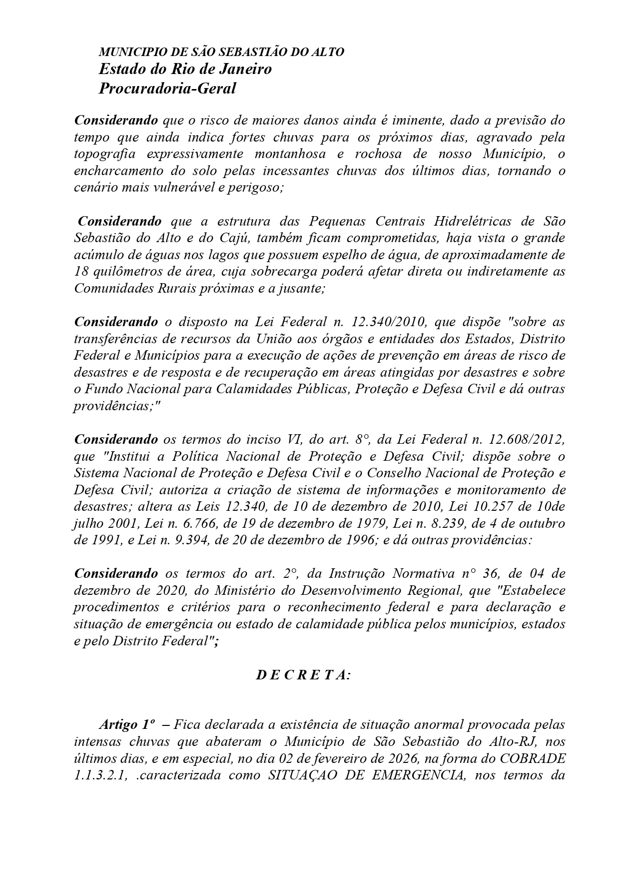 Em razão das fortes chuvas registradas na noite desta segunda-feira, o Município de São Sebastião do Alto decretou Estado de Emergência, através do decreto N°2615.
