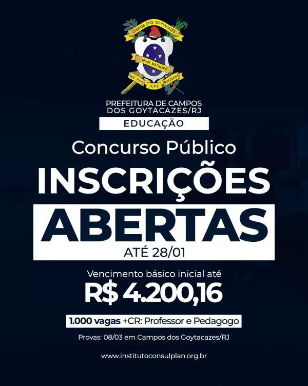 A seleção reforça o compromisso da Prefeitura de Campos dos Goytacazes com o fortalecimento da educação pública, a valorização dos profissionais do magistério e a ampliação do quadro efetivo de servidores. O edital completo, com informações detalhadas sobre cargos, requisitos, etapas do concurso e conteúdo programático, está disponível no site do Instituto Consulplan, onde também podem ser obtidos esclarecimentos adicionais. Dúvidas podem ser sanadas pelo telefone 0800 100 4790.