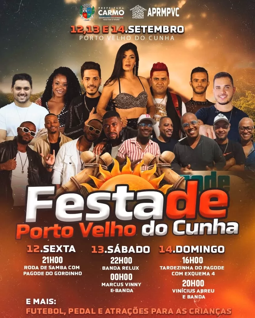 A Prefeitura Municipal de Carmo, através da Secretaria Municipal de Cultura e Turismo, e a Associação de Produtores Rurais e Moradores de Porto Velho do Cunha convidam toda a população para a Festa de Porto Velho do Cunha, que acontece nos dias 12, 13 e 14 de setembro.
