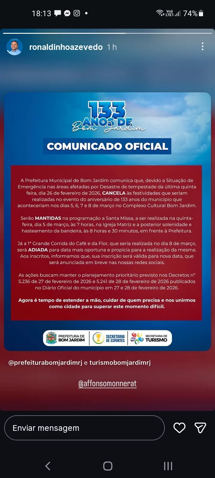 A Prefeitura Municipal de Bom Jardim comunica que, devido a situação de emergência nas áreas afetadas por desastre de tempestade da última quinta feira, dia 26 de fevereiro de 2026, cancelou às festividades que seriam realizadas no evento do aniversário de 133 anos do município que aconteceriam nos dias 5, 6, 7 e 8 de março no Complexo Cultural Bom Jardim.