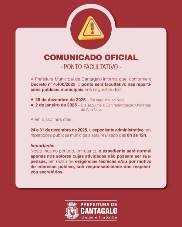 Já a Prefeitura Municipal de Cantagalo informou que, conforme o Decreto nº 4.400/2025, o ponto será facultativo nas repartições públicas municipais nos seguintes dias: