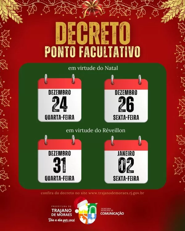 A Prefeitura de Trajano de Moraes anunciou ponto facultativo nas repartições públicas municipais nos dias 24 e 26 de dezembro de 2025, e também no dia 31 de dezembro e 2 de janeiro de 2026.