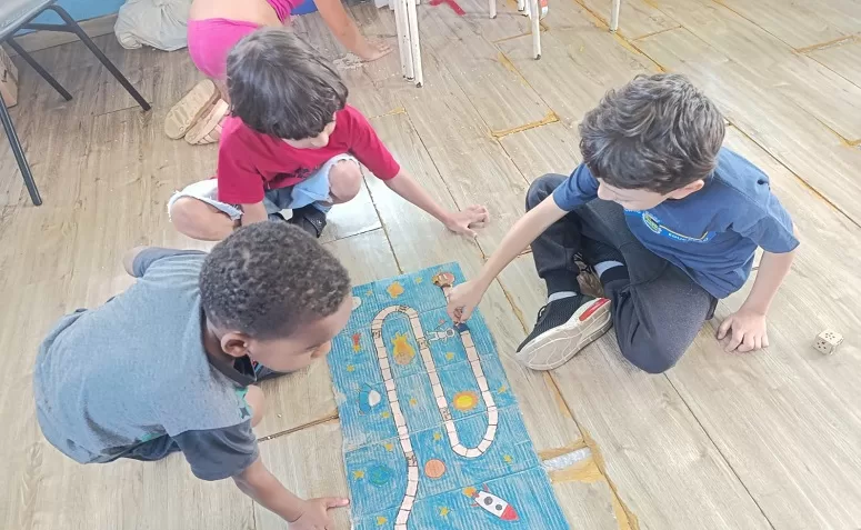 Na CMEI, a professora organizou uma dinâmica com sua turma: enquanto as crianças sugeriam brincadeiras com cada letra do alfabeto, a educadora pensava maneiras de integrá-las à BNCC (Base Nacional Comum Curricular). Foi assim que o “A” virou amarelinha, ensinando contagem, localização espacial e formas geométricas. O “B” trouxe o Banco Imobiliário, que abriu espaço para práticas de contagem e noções de organização.