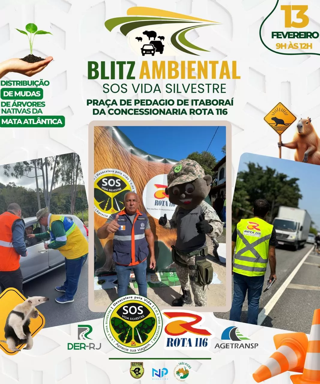 Na sexta-feira, dia 13, de 9h às 12 horas, a Concessionária, em parceria com a ong SOS Vida Silvestre estará realizando mais uma edição da Blitz Ambiental, na Praça de Pedágio de Itaboraí, na altura do quilômetro 1, com o objetivo de conscientizar os motoristas sobre a importância de preservar a flora e a fauna que compõem o trecho concedido da RJ 116. A Blitz, que conta com o apoio e parceria do DER e da Agetransp, além do Batalhão Estadual de Polícia Rodoviária, fará também a distribuição de mudas de plantas nativas da Mata Atlântica.