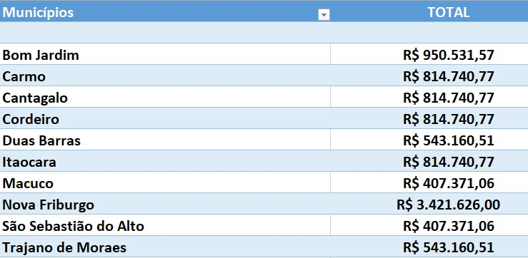 Confira abaixo os valores dos municípios da região:
